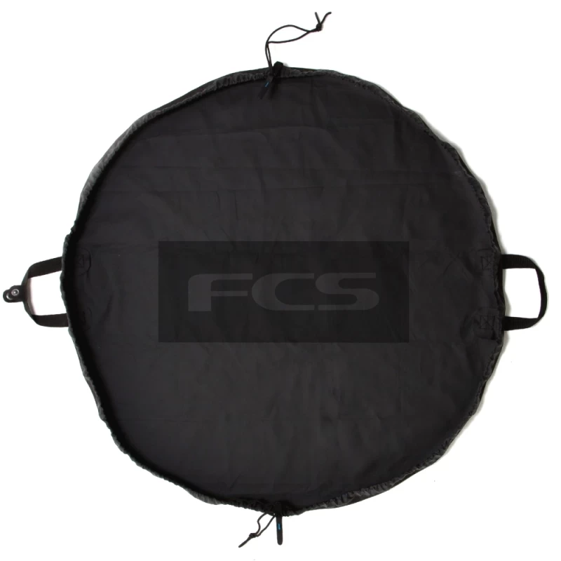 A very simple idea which works great – especially if your local break has a horrible stony car park. The tarpee circle lies down flat while you stand on it and get out of your wet gear (free of dust/dirt & Sand). You can then just pull up the drawstrings to tun it into a simple bag. Black with large FCS Logo. 600d Laminated Polyester with side handles.